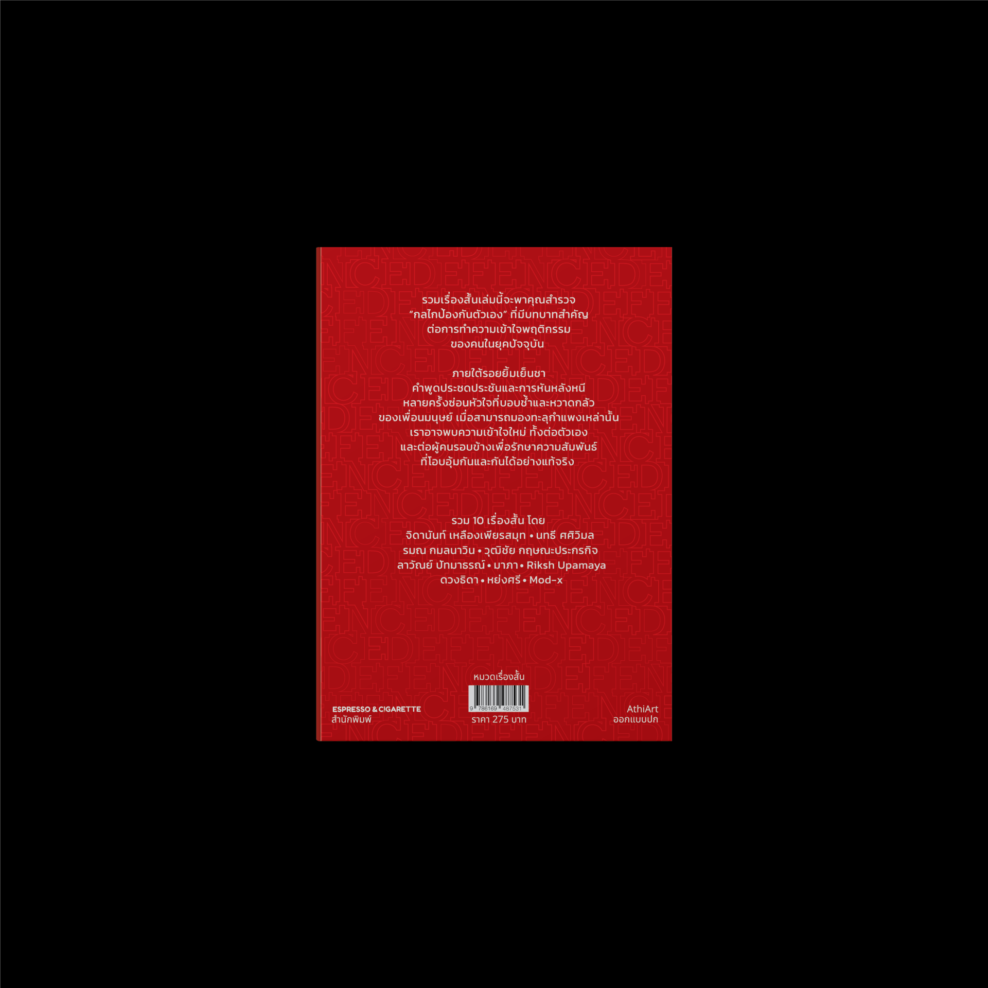 Espresso & Cigarette ชวนคุณออกเดินทางสู่โลกแห่งจิตใต้สำนึก ดำดิ่งลงใจกลางความเปราะบางที่ซ่อนลึกในผู้คน ผ่านผลงานจาก 10 นักเขียนมืออาชีพซึ่งหยิบยกเอาทฤษฎีกลไกป้องกันตนทางจิตมาสร้างเป็นเรื่องสั้นที่เน้นความสนุก สะท้อนพฤติกรรมและประเด็นร่วมสมัยอย่างสร้างสรรค์