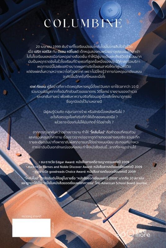 20 เมษายน 1999 ฝันร้ายที่โรงเรียนมัธยมโคลัมไบน์ไม่อาจลืมไปชั่วชีวิต เมื่อ เอริก แฮร์ริส กับ ดีแลน คลีโบลด์ เด็กหนุ่มสองคนพร้อมอาวุธครบมือได้บุกเข้าไปในโรงเรียนและลงมือก่อเหตุอย่างเลือดเย็น ทำให้มีผู้บาดเจ็บและเสียชีวิตจำนวนมาก นับเป็นเหตุกราดยิงในรั้วโรงเรียนที่ร้ายแรงที่สุดครั้งหนึ่งของประวัติศาสตร์อเมริกา เหตุการณ์นี้ไม่เพียงสร้างบาดแผลทางจิตใจแสนสาหัสให้แก่ผู้รอดชีวิต แต่ยังแผ่คลื่นความหวาดผวาไปทั่วประเทศ เพราะไม่มีใครรู้ว่าการก่อเหตุลอกเลียนแบบจะเกิดขึ้นอีกครั้งที่ไหน และเมื่อไร เดฟ คัลเลน ผู้สื่อข่าวที่เกาะติดเหตุสังหารหมู่นี้ตั้งแต่วันแรก เขาใช้เวลากว่า 10 ปี รวมรวบข้อมูลจากทั้งบันทึกส่วนตัวของฆาตกร วิดีโอเทป รายงานของตำรวจ และบทสัมภาษณ์ เพื่อเฟ้นหาความจริงที่ซ่อนอยู่เบื้องลึกโศกนาฏกรรมซึ่งถูกปิดบังไว้นานหลายปี มีผู้สมรู้ร่วมคิด กลุ่มก่อการร้าย หรือลัทธิเบื้องหลังหรือไม่ ? อะไรคือแรงจูงใจแท้จริงที่ทำให้เด็กสองคนลงมือ ? แล้วเราจะป้องกันไม่ให้มันเกิดซ้ำได้อย่างไร ? จากการทุ่มเท ค้นคว้าอย่างยาวนาน ทำให้ “โคลัมไบน์” คือคำตอบที่ครบถ้วนและครอบคลุมทุกคำถาม เรื่องราวฉากต่อฉากถูกถ่ายทอดอย่างสมจริง ชวนระทึก รายละเอียดอันน่าทึ่งพาเราสัมผัสทุกอารมณ์ได้อย่างแนบเนียน ประกอบกับจังหวะการเล่าอันเป็นเอกลักษณ์ของคัลเลน ทำให้หนังสือเล่มนี้…ยากที่จะหยุดอ่านได้