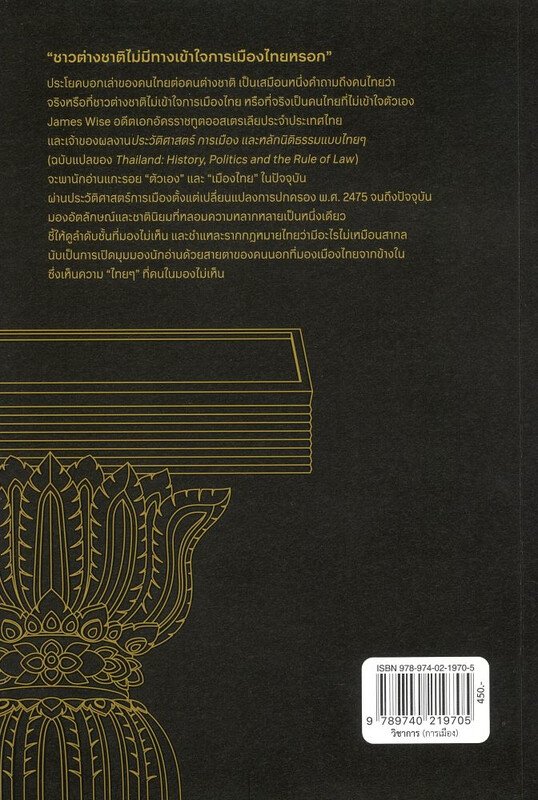 “James Wise” อดีตเอกอัครราชทูตออสเตรเลียประจำประเทศไทย พาผู้อ่านย้อนรอยประวัติศาสตร์การเมืองไทย ตั้งแต่เหตุการณ์เปลี่ยนแปลงการปกครองในปี พ.ศ. 2475 ไล่เรียงผ่านการปฏิรูปของกษัตริย์ สู่การปฏิวัติของคณะราษฎร ซึ่งต่างมีต้นแบบจากตะวันตกทั้งคู่ กระทั่งเข้าสู่ยุคการเมืองภายใต้การนำของกองทัพ และช่วงเปลี่ยนผ่านหลังรัฐธรรมนูญปี พ.ศ. 2540 ที่วางรากฐานการเมืองไทยร่วมสมัยอย่างลุ่มลึก