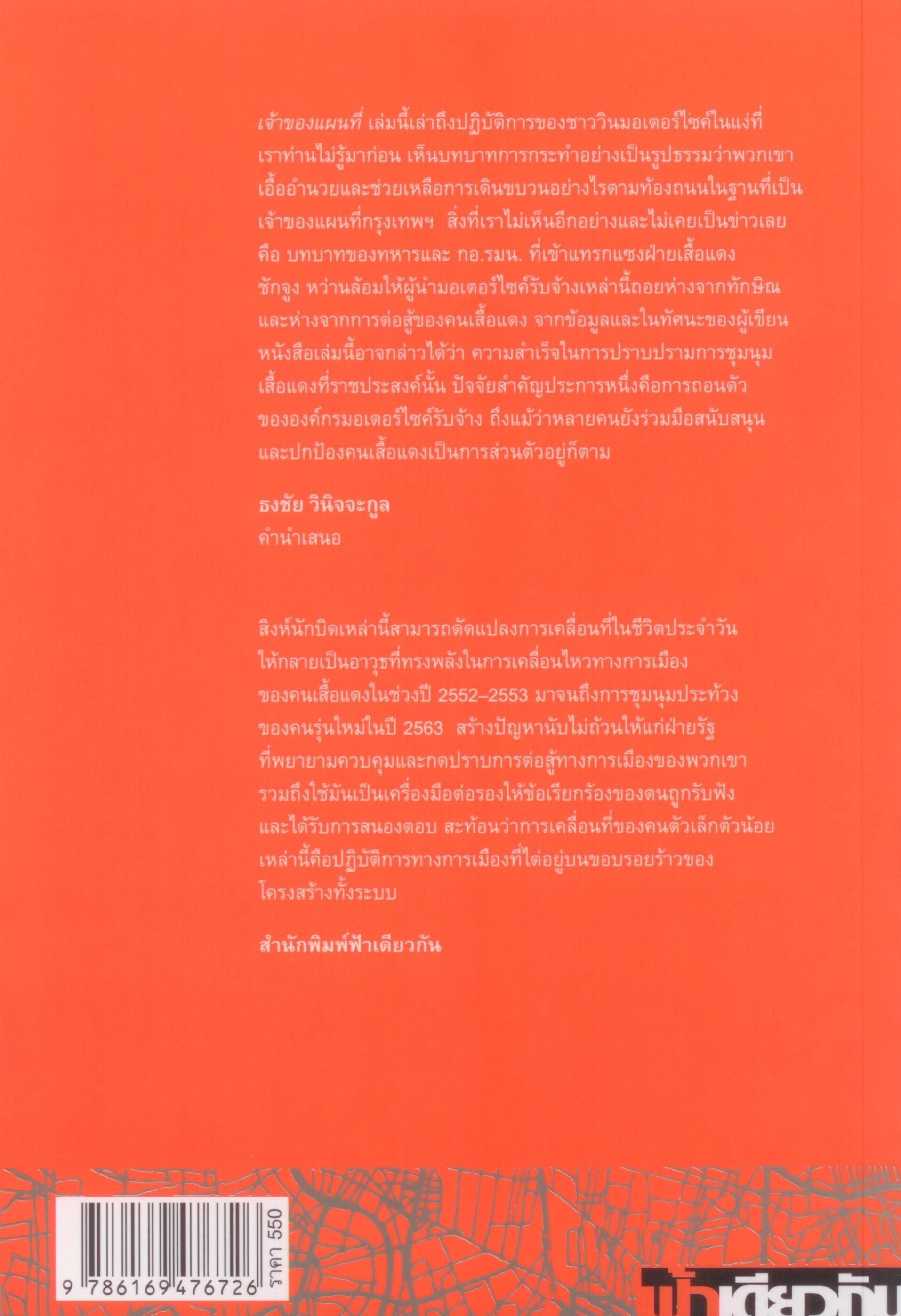 เจ้าของแผนที่ : มอเตอร์ไซค์รับจ้าง การเคลื่อนที่ และการเมืองในกรุงเทพมหานคร เล่มนี้เล่าเรื่องของชาวมอเตอร์ไซค์รับจ้างในกรุงเทพฯ ทั้งประวัติความเป็นมาและความเป็นอยู่ของพวกเขา ทั้งชีวิตประจำวันรูปธรรมและแง่มุมที่ไม่ประจักษ์ชัดกับตา เช่น ระบบหัวคิว เครือข่ายอิทธิพลที่กดทับเอาเปรียบพวกเขา ความเปลี่ยนแปลงทางการเมืองที่กระทบต่อพวกเขา ฯลฯ แต่ที่เน้นมากคือความเชี่ยวชาญพื้นที่ถึงระดับซอกซอย จนสามารถเคลื่อนไหวบนท้องถนนของมหานครรถติดได้อย่างคล่องแคล่วรวดเร็วเป็นพิเศษ พวกเขาเป็น “เจ้าของแผนที่” ของกรุงเทพฯ