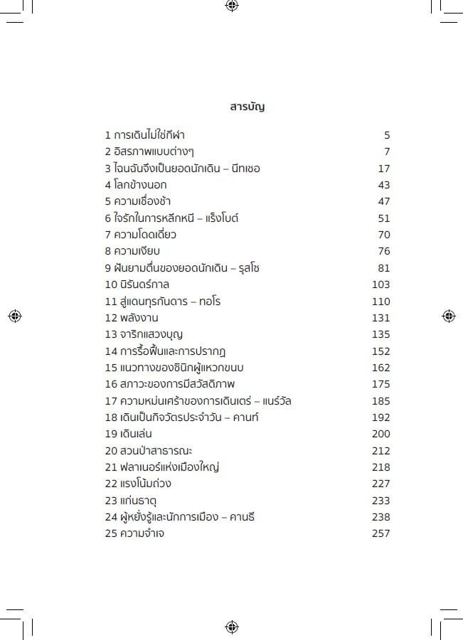 หนังสือเล่มนี้จะพาไปสำรวจปรัชญาที่ซ่อนอยู่ในการเดิน ตั้งแต่การก้าวสั้น ๆ ในชีวิตประจำวันไปจนถึงการจาริกแสวงบุญอันยาวไกล Frederic Gros นักปรัชญาชั้นนำ จะชวนตั้งคำถามว่า เหตุใดเหล่านักคิดผู้ยิ่งใหญ่ในประวัติศาสตร์จึงเป็นนักเดินตัวยง และการเดินส่งผลต่อความคิดและชีวิตพวกเขาอย่างไร