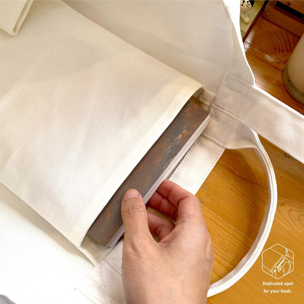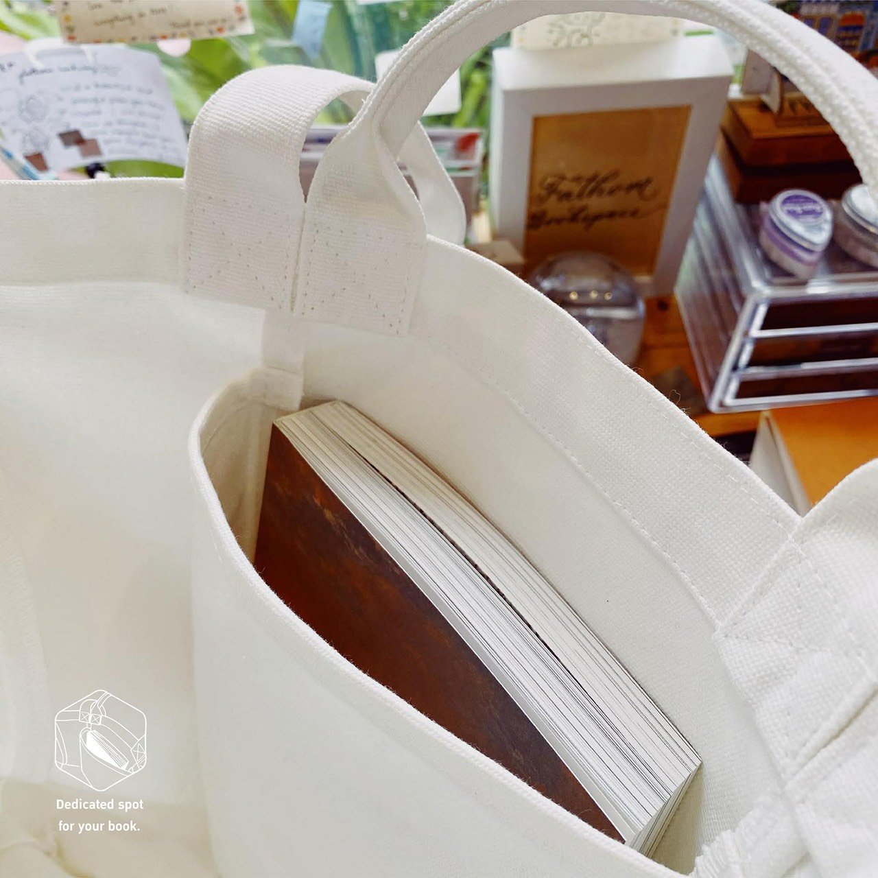 กระเป๋าผ้าใบแรกจาก Fathom ที่พาเครื่องพิมพ์ หนังสือ ดอกไม้ เปียโน กาแฟ มาอยู่รวมกัน และเพื่อให้สมกับเป็นถุงผ้าของร้านหนังสือ มีช่องที่ออกแบบมาเพื่อให้การพกหนังสือซักเล่ม (หรือ 2 เล่ม) สะดวกปลอดภัย